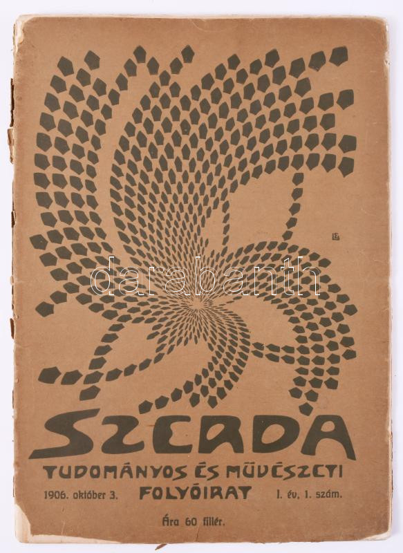 Szerda. Tudományos és művészeti folyóirat. 1906. I. évf. 1-4. szám.: Szerkesztő és laptulajdonos Gundel Antal. [Budapest, 1906. Hornyánszky V.] A Nyugat szellemi elődjének tekinthető lapból összesen 7 szám jelent meg. Kaffka Margit: Bölcsődal, Ady: Özvegy legények tánca első közlésekkel. Ambrus Zoltán, Szini Gyula, Fülep Lajos, Gombocz Zoltán, Meller Simon, Cholnoky Viktor írásaival. Eredeti, enyhén sérült papírborítókkal.
