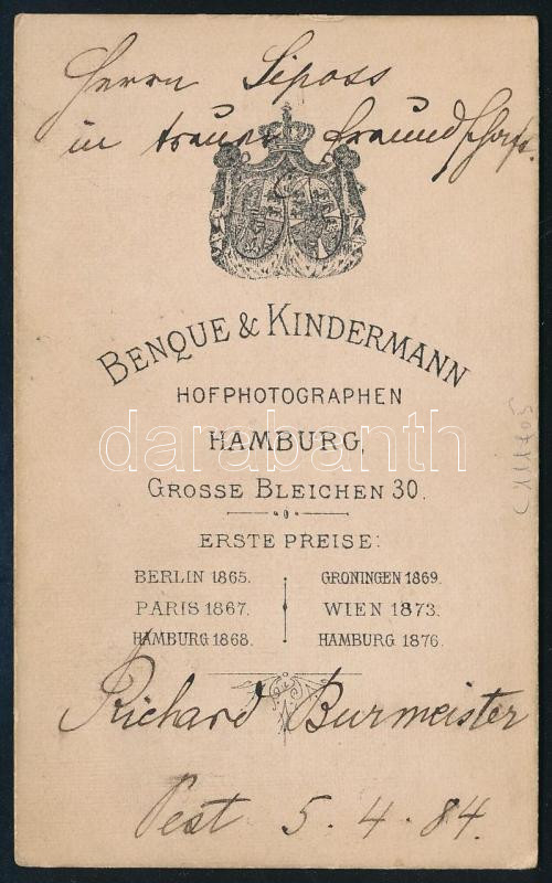 1884 Richard Burmeister (1860-1944) zeneszerző dedikált portréja, kemé... https://www.darabanth.com/de/45-Gross-Auktion/45.1/Kunst-Dokumente-andere-Sammelgebiete/Foto~18977/1884-Richard-Burmeister-1860-1944-zeneszerzo-dedikalt-portreja-kemenyhatu-foto-Benque-amp~II3447261