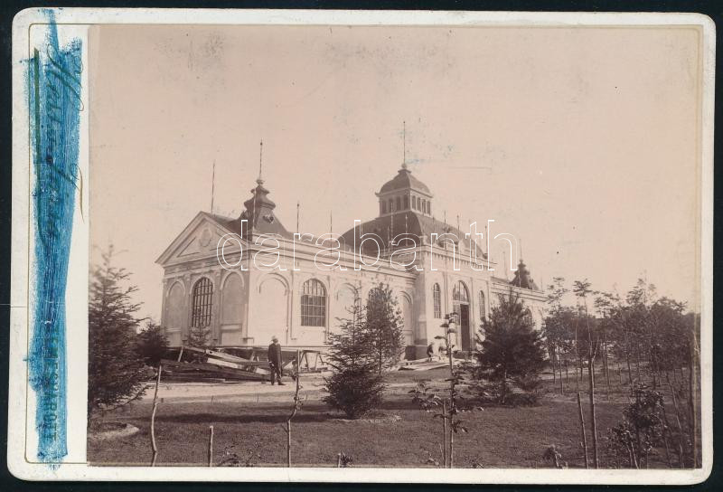 1891 Temesvár, országos ipari és mezőgazdasági kiállítás, az Osztrák-Magyar Államvasút pavilonja. Keményhátú fotó Hess és Társa temesvári műterméből, a hátoldalon német nyelvű felirattal, firkákkal, 11x17 cm
