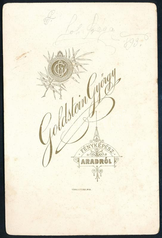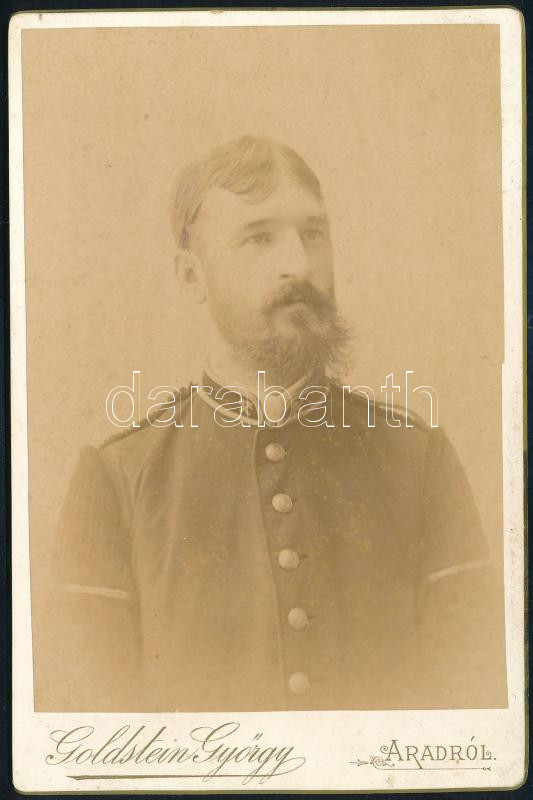 Beschreibung: 1893 Bányász egyenruhában, kabinetfotó Goldstein György aradi műterméből, a verzón ceruzával írt feljegyzéssel, kissé vetemedett, 16x10,5 cm. Ritka!