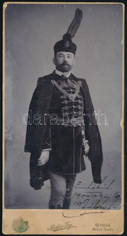 1904 felsőalmási Fábry Sándor (1859-1917) jogász, Békés vármegye alispánja, majd főispánja, az Aradi és Csanádi Egyesült Vasutak, illetve az Alföldi Gazdasági Vasút elnök-igazgatója díszmagyaros portréja, a képen saját kezű dedikációjával: ,,Emlékül. 1904 máj 16 Dr Fábry S." Kabinetfotó Békés Gyula (Gyula, Békéscsaba és Orosháza) műterméből, kissé viseltes, 20,5x10,5 cm