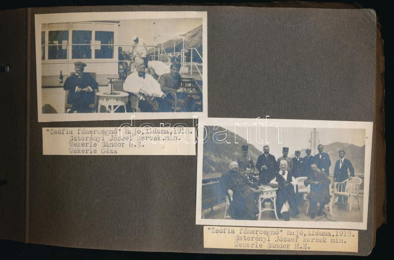 1917-1929 Régi fotóalbum, közte több fényképpel Wekerle Sándor miniszterelnökről, valamint Wekerle Gézáról, Szterényi József kereskedelmügyi miniszterről és 3 db fénykép a Jóvátételi Bizottságról, 84 db fotóval, feliratozva, főként 7,5×10,5 cm