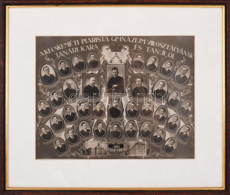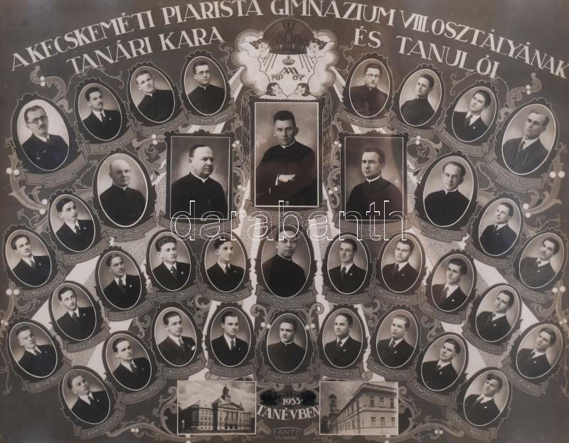 1933 A Kecskeméti Piarista Gimnázium VIII. osztályának tanári kara és tanulói 1933 tanévben, Kecskemét, Fanto műterméből, üvegezett fa keretben, paszpartuban, 24,5x31,5 cm, keret: 40x46 cm