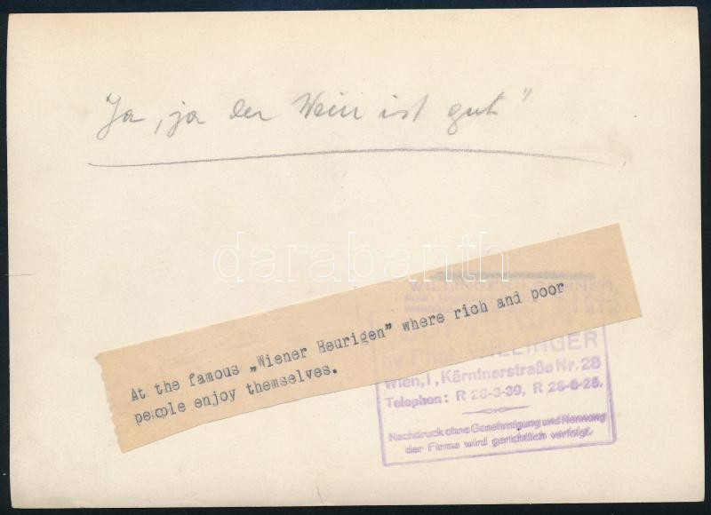 1935 "Igen, igen, a bor jó!" A bécsi "Wiener Haurigen" étterem és tavernában készített fotó, ahol a szegény és gazdag ember egyformán érzi magát, Wilhelm Willinger (1879-1943) fotós pecsétjével és szövegével a hátoldalon, jó állapotban, 13×18 cm