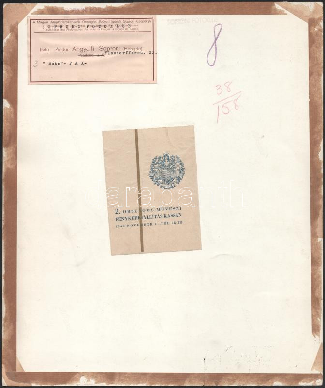1943 Angyalfi Andor (1892-1973): "Béke" - Pax, a hátoldalán "Magyar Amatőrfényképezők Országos Szövetségének Soproni Csoportja (rajta: Soproni Fotoklub bélyegzéssel)", "2. Országos Művészi Fényképkiállítás Kassán 1943 November 11-től 28-ig" címkékkel, és "Soproni Fotoklub" bélyegzésekkel, 33x28 cm