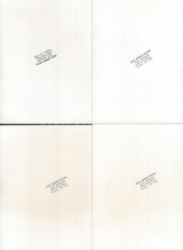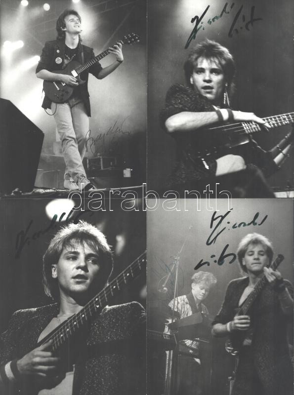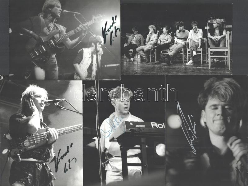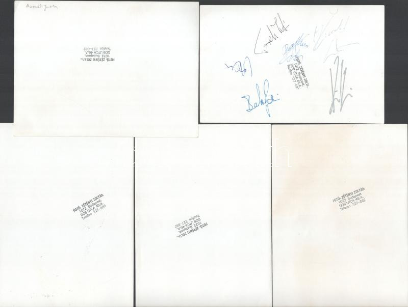 Első Emelet zenekar csoportképe és a tagok portré felvételei, valamennyi kép dedikálva (a csoportkép a hátoldalán és mindenki által), Zétényi Zoltán pecsétjével jelzett 9 db vintage fotó, 13x18 cm