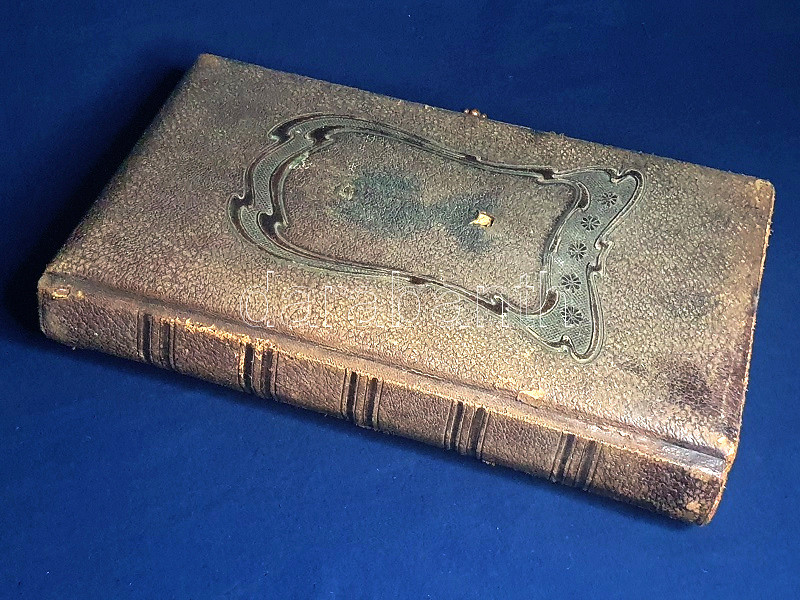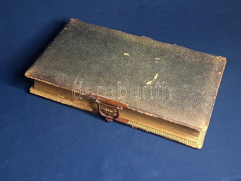 Keménytáblás, vaknyomásos, dombornyomásos, enyhén sérült, kissé kopott korabeli bőrkötésben, oldalt kötetzáró kapoccsal, aranyozott festésű lapszélekkel. Jó példány.