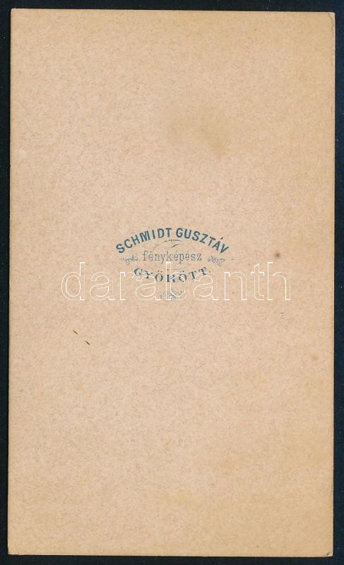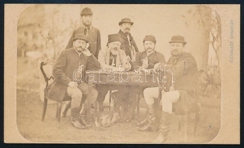 Beschreibung: cca 1860-1870 Előkelő férfitársaság pipázó urakkal, asztal alatt fekvő kutyával, vizitkártya Schmidt Gusztáv győri műterméből, 6x10,5 cm. Ritka!