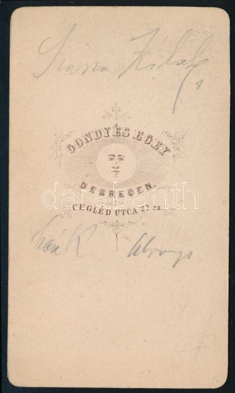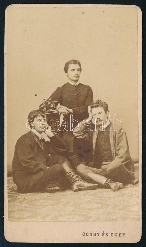 Beschreibung: cca 1867 Szana Tamás (1844-1908) szerkesztő, kritikus, művészettörténész barátaival, keményhátú fotó Gondy és Egey debreceni műterméből, 10,5×6,5 cm