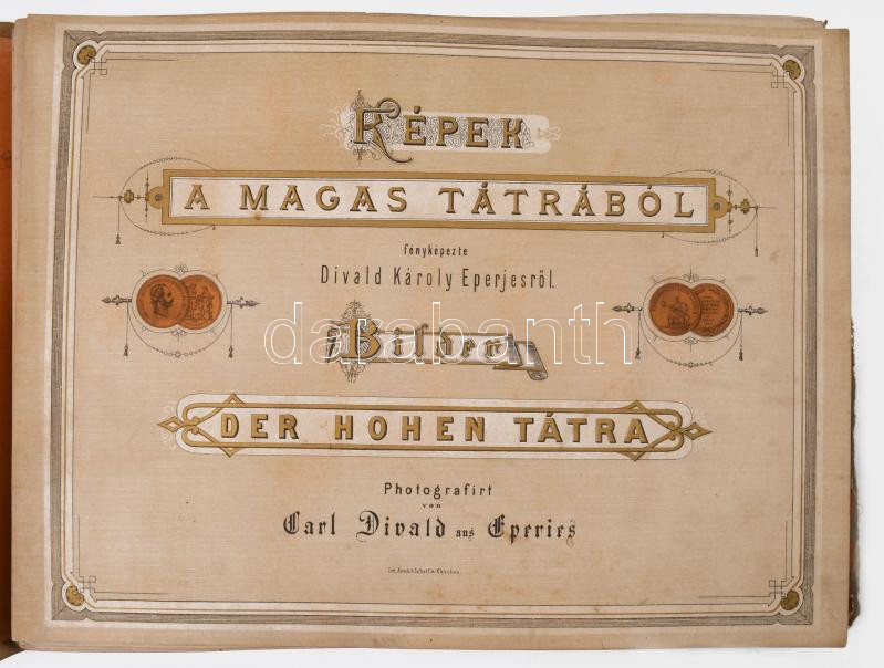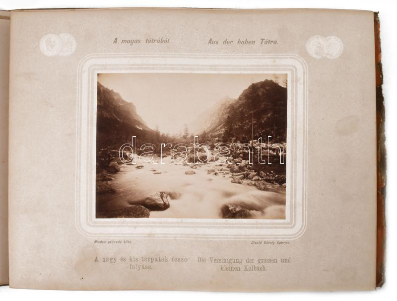 cca 1873-1880 Képek a Magas Tátrából. Fényképezte Divald Károly Eperjesről. Bilder der Hohen Tátra. Photografirt von Carl Divald aus Eperies. [Eperjes, én, Divald Károly], 1 (litografált címlap, lith. Kosch & Scharfin Kaschau [Kassa]) + 30 (fekete-fehér fotók, feliratozott kartonokon) t. Magyar és német nyelvű címlap és feliratokkal. Korabeli aranyozott egészvászon mappában, kopott, foltos, sérült mappával, néhány tábla szélén kis sérülésekkel, két tábla foltos, ami közül az egyik a fotót is érinti, fotók: 12x16 cm, lapok/táblák): 24x32 cm, mappa: 25,5x33x2 cm.
