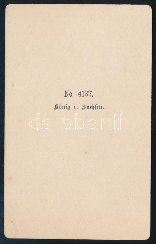 cca 1880 I. Albert szász király (teljes nevén Friedrich August Albert Anton Ferdinand Joseph Karl Maria Baptist Nepomuk Wilhelm Xaver Georg Fidelis von Sachsen) (1828-1902) portréja, vizitkártya, 10x6 cm // cca 1880 Albert, King of Saxony (1828-1902), cdv photo, 10x6 cm