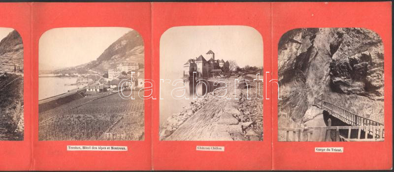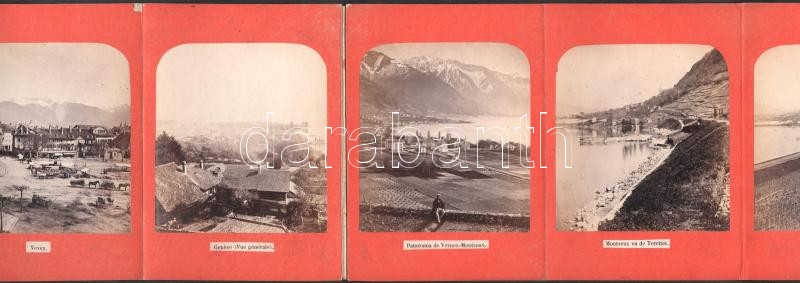 Beschreibung: cca 1880 Svájc, "Souvenirs photographiques des bords du lac de Genevé", 10 db fotót tartalmazó leporelló, 13×10 cm