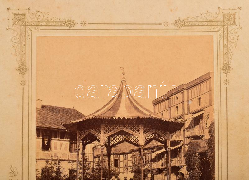 Beschreibung: cca 1900 Előpatak (Valcele), Főkút fotója a háttérben villákkal, fotó kartonon, Robert Kelement előpataki műterméből, kissé foltos kartonnal, 22x16 cm