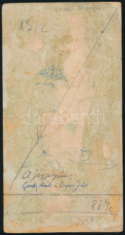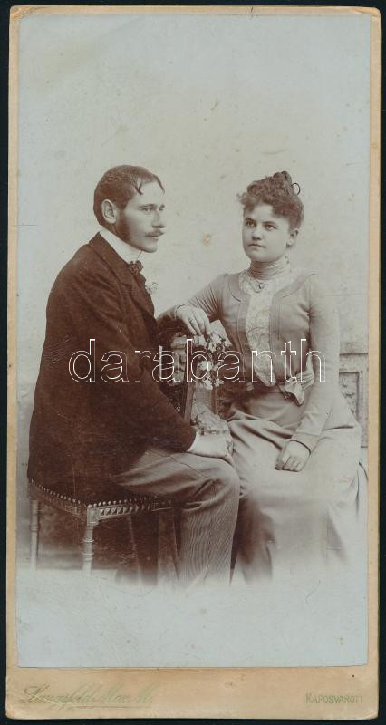 cca 1900 Kaposvár, Gundy László és Donner Júlia jegyespár portréfotója, Gundy apja Gundy György (1820-1880) operaénekes, Donner Júlia, a kaposvári Donner sörgyáros családtagja, akinek alapítójáról, a kocsmáros, serfőzőmester Donner Jánosról Kaposvár Donnerváros a nevét is kapta, keményhátú fotó Langsfeld Mór kaposvári műterméből, fakó kartonnal, sérült verzoval, 20x11 cm