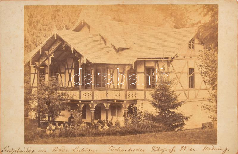 Beschreibung: cca 1900 Lublófüred (Bad Lublau/Ľubovnianske Kúpele,Kúpele Lubovna) fürdőház fotója, fotó kartonon, feliratozva, kissé foltos kartonnal, 11x16 cm