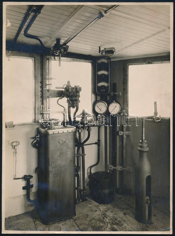 cca 1920-1925 Az olasz Societa Nicola Romeo di Saronno vállalat által gyártott mozdony vezetőfülkéje, fotó, jelzés nélkül, 23x17 cm // cca 1920-1925 Interior of the driver's cab of a locomotive built by the Italian Societa Nicola Romeo di Saronno company, photo, unmarked, 23x17 cm