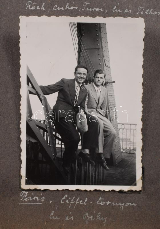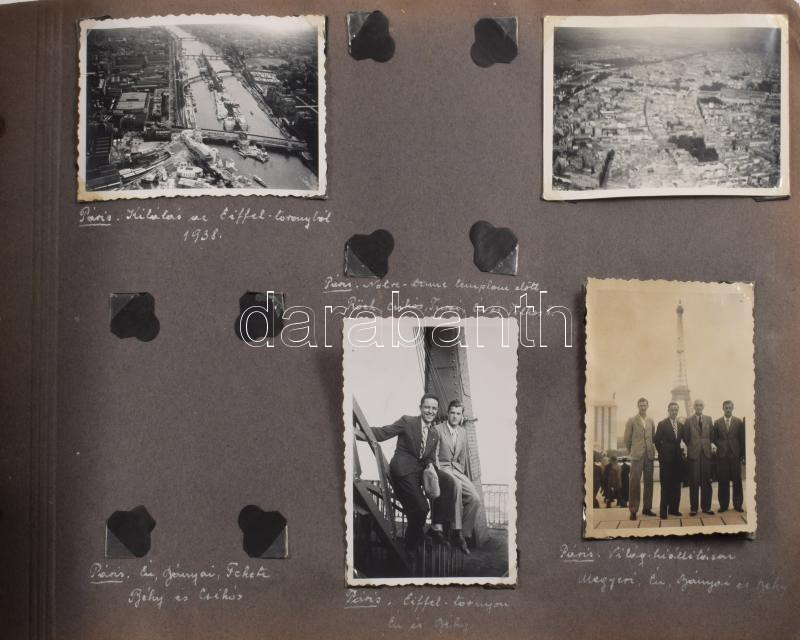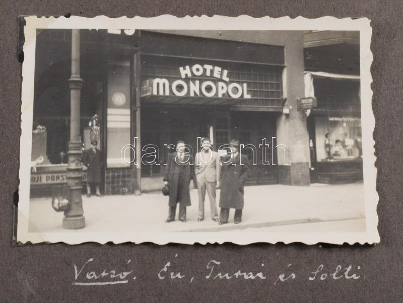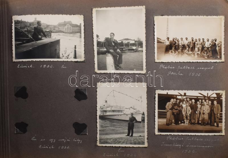 cca 1920-1940 Gombkötő Imre (1910-1988) labdarúgó (1933-ig az MTK-ból kivált Budapesti Atlétikai Klub (BAK) futballcsapatának tagja, 1933 és 1934 között a Bocskay FC, majd 1934-től 1939-ig az újpesti Phöbus FC játékosa) fényképalbuma, összesen 140 db fotóval, közte számos érdekes felvétellel a BAK, a Bocskay és a Phöbus csapatairól, kortárs labdarúgókról (Palotás István, Gallowich Tibor, Móré János, Teleki Pál, stb.), utazási és egyéb képekkel (többségük fotósarkokkal rögzítve, az albumlapokon feliratozva). Bakelittáblás, zsinórfűzéses albumban, az album kissé sérült, helyenként szakadt hártyapapírokkal, 23x32x3 cm ///