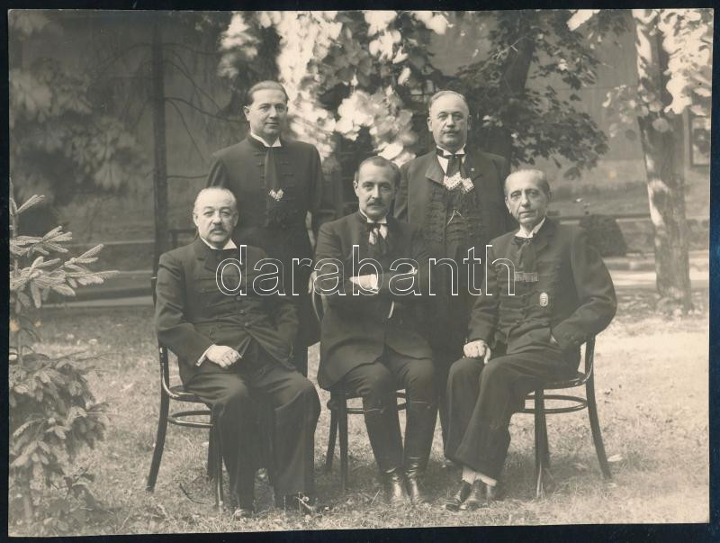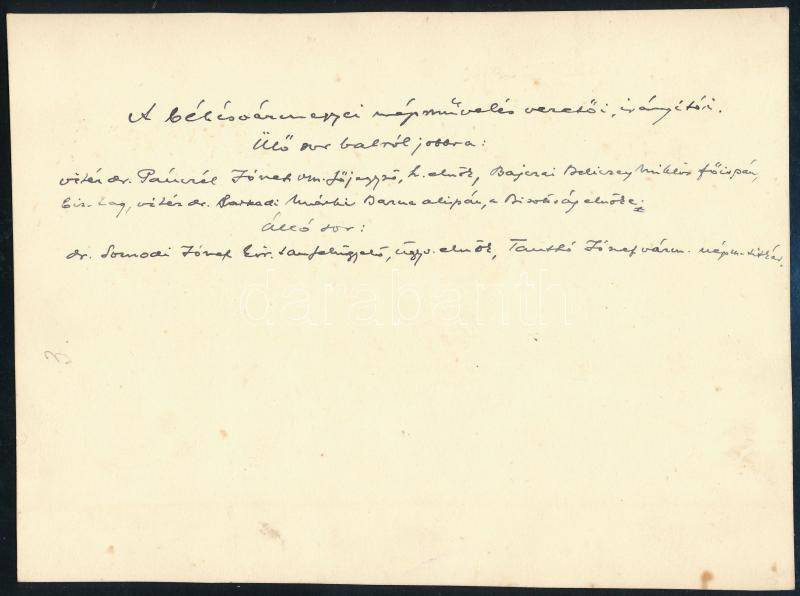 cca 1930 Békésvármegye Törvényhatósági Iskolánkívüli Népművelési Bizottságának vezetői, a képen (ülő sor, balról jobbra): vitéz Pánczél József vármegyei főjegyző, helyettes elnök; bajczai Beliczey Miklós főispán; vitéz sarkadi Márki (Márky) Barna alispán, a bizottság elnöke; (álló sor): Somodi József kir. tanfelügyelő, ügyvezető elnök; Tantó (Tanthó) József vármegyei népművelési titkár. A hátoldalon feliratozott fotó, 15x20,5 cm