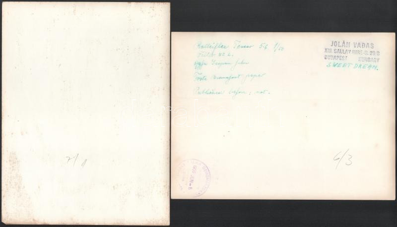 cca 1940 Vadas Jolán (1910-1978) 2 db vintage fotőművészeti alkotása: Sweet Dream, Halászbástya, az egyik a hátoldalán feliratozott és pecséttel jelzett, a sarkain és a szélein kis kopásnyomokkal,az egyik fotó egyik sarkán apró hiánnyal, 24x18 cm x2