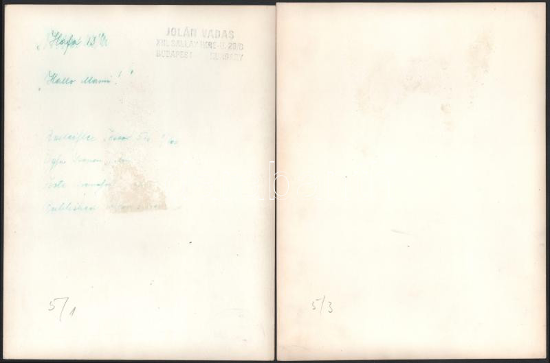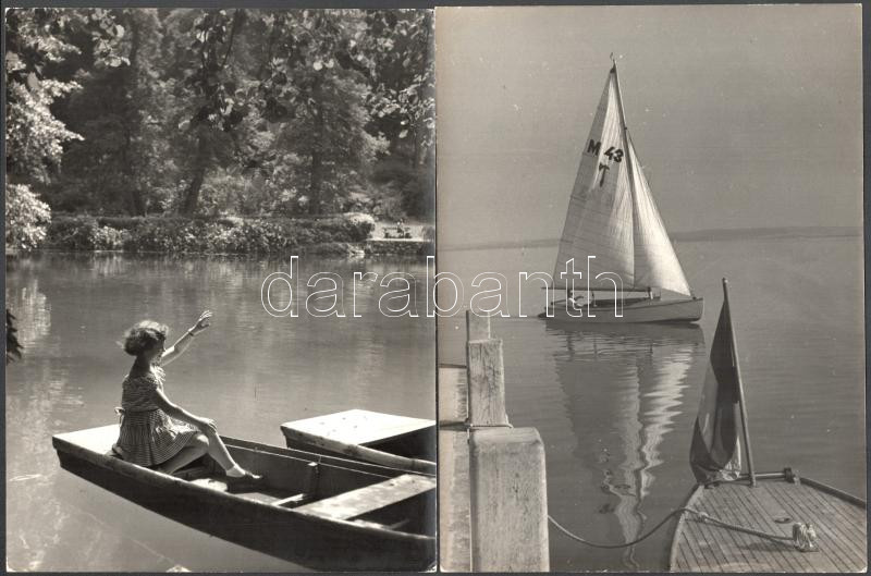 cca 1940 Vadas Jolán (1910-1978) 2 db vintage fotőművészeti alkotása: Vitorlás a Balatonon, Hallo Mami! (Csónakázó gyermek), az egyik a hátoldalán feliratozott és pecséttel jelzett, a sarkain kis kopásnyomokkal, 24x18 cmx2