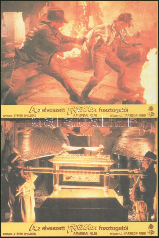 cca 1989 előtt készült, "Az elveszett frigyláda fosztogatói" című amerikai film jelenetei és szereplői, 6 db produkciós filmfotó (vitrinfotó, lobbyfotó) nyomdatechnikával sokszorosítva kartonpapírra, egyoldalas nyomással, a használatból eredő (esetleges) kisebb hibákkal, 18x24 cm