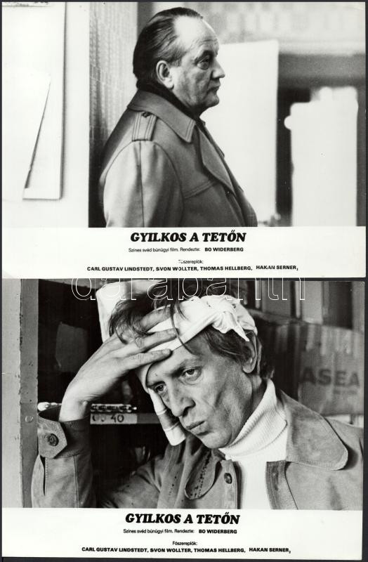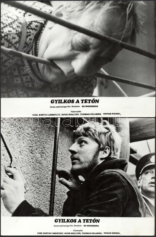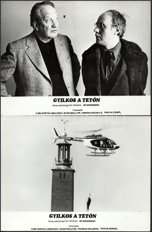 cca 1989 előtt készült, "Gyilkos a tetőn" című svéd film jelenetei és szereplői, 11 db vintage produkciós filmfotó (vitrinfotó, lobbyfotó) ezüst zselatinos fotópapíron, a használatból eredő (esetleges) kisebb hibákkal, 18x24 cm