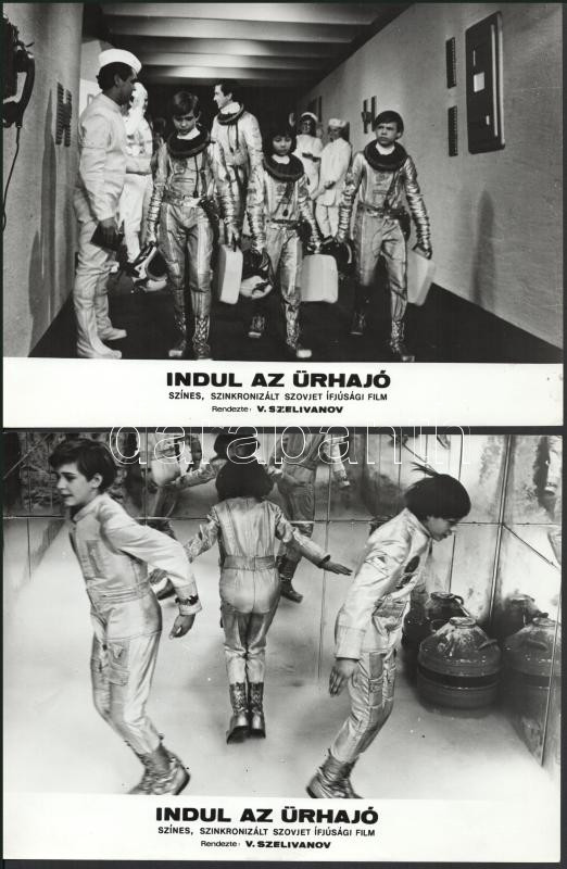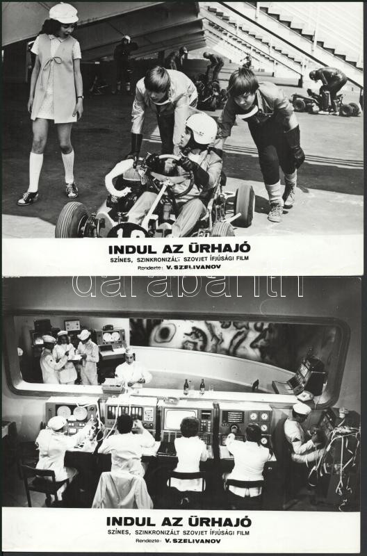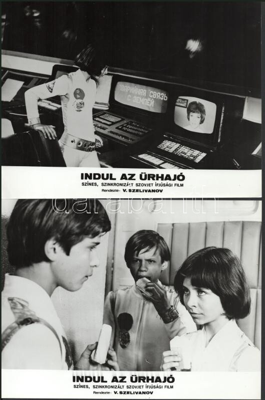 cca 1989 előtt készült, "Indul az űrhajó" című szovjet film jelenetei és szereplői, 13 db vintage produkciós filmfotó (vitrinfotó, lobbyfotó) ezüst zselatinos fotópapíron, a használatból eredő (esetleges) kisebb hibákkal, 18x24 cm