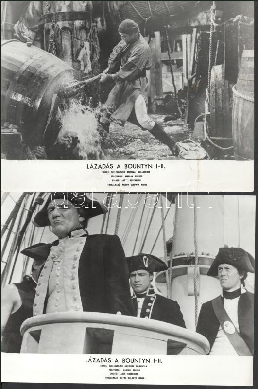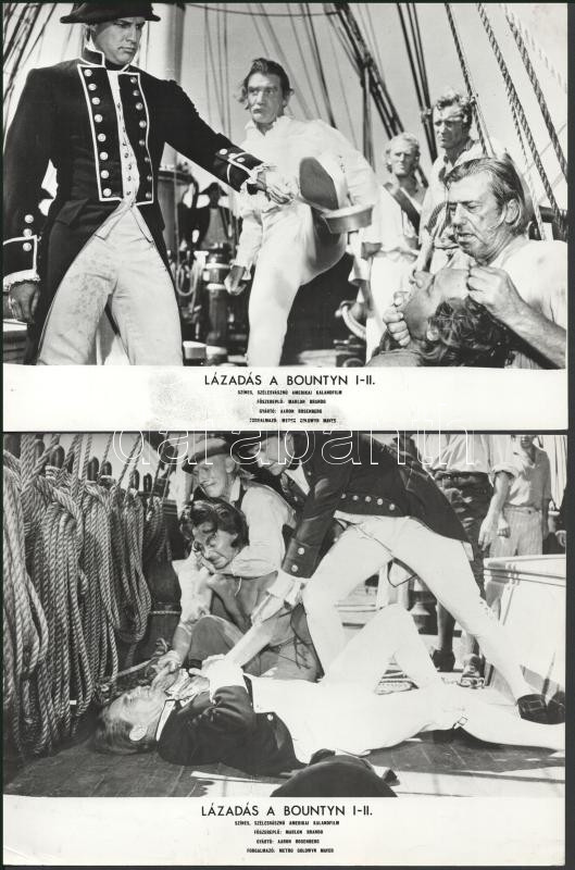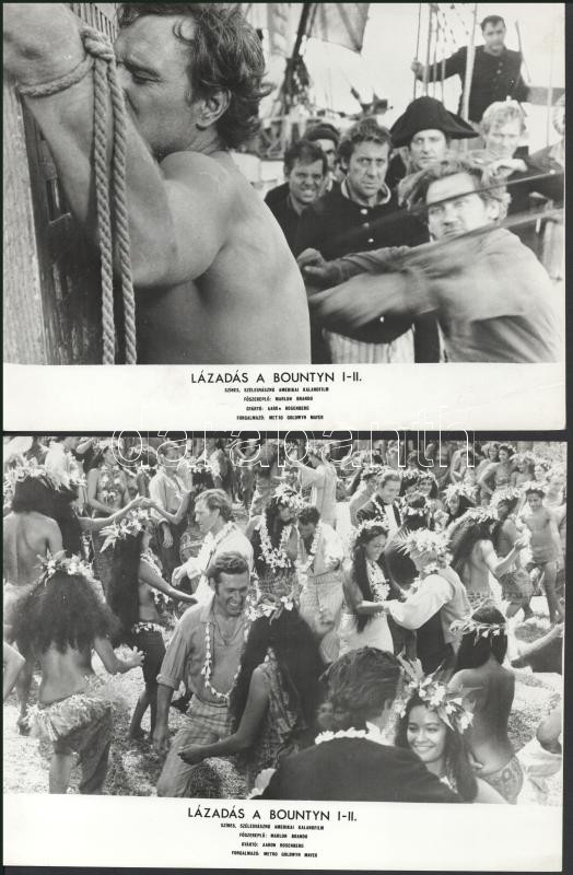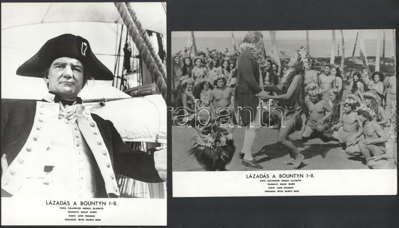 cca 1989 előtt készült, "Lázadás a Bountyn" című amerikai film jelenetei és szereplői, 8 db vintage produkciós filmfotó (vitrinfotó, lobbyfotó) ezüst zselatinos fotópapíron, a használatból eredő (esetleges) kisebb hibákkal, 18x24 cm