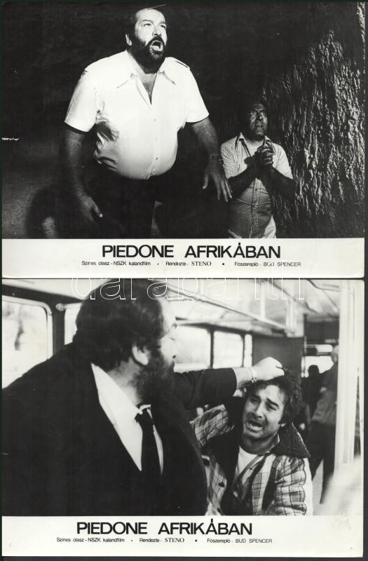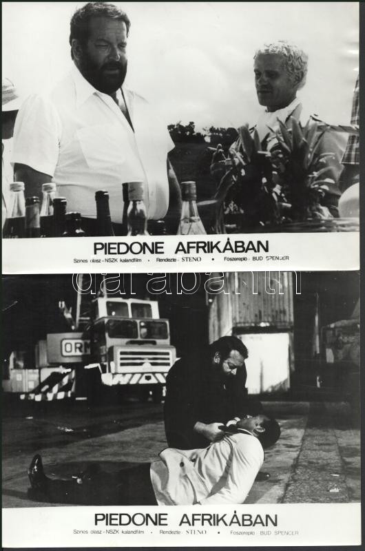 cca 1989 előtt készült, "Piedone Afrikában" című olasz-NSZK film jelenetei és szereplői, 7 db vintage produkciós filmfotó (vitrinfotó, lobbyfotó) ezüst zselatinos fotópapíron, a használatból eredő (esetleges) kisebb hibákkal, 18x24 cm