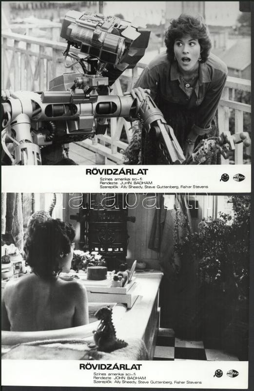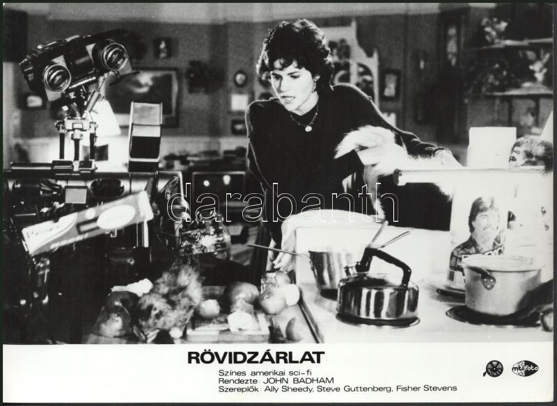 cca 1989 előtt készült, "Rövidzárlat" című amerikai sci-fi film jelenetei és szereplői, 7 db vintage produkciós filmfotó (vitrinfotó, lobbyfotó) ezüst zselatinos fotópapíron, a használatból eredő (esetleges) kisebb hibákkal, 18x24 cm