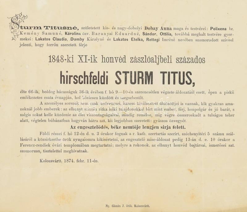 1848-as honvéd halotti értesítője hirschfeldi Sturm Titus (1808-1874) a piski csatában részt vett XI. honvéd zászlóaljbeli százados. Érdekesség, hogy ahogy a halotti éretsítő is említi, a halál napja is éppen a piski csata évfordulójára esett. Üvegezett keretben, hozzá a piski csatáról szóló újságcikkel
