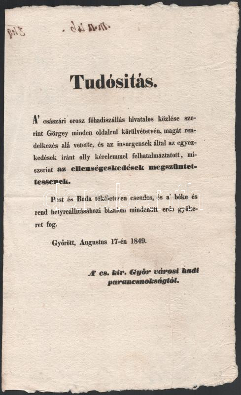 1849 A világosi fegyverletételről szóló császári hirdetmény. Győr városában kiadva, Tudósítás, a császári orosz főhadiszállásá közlése szerint Görgey minden oldalrul körülvetetvén 24x38 cm