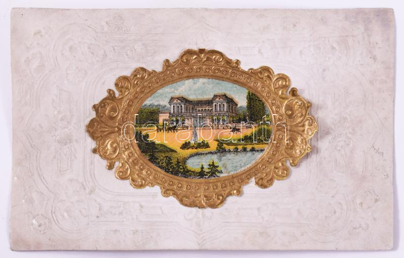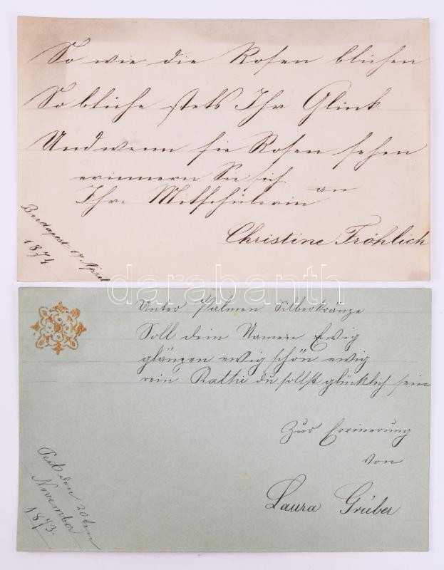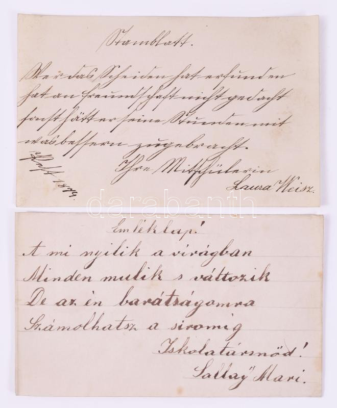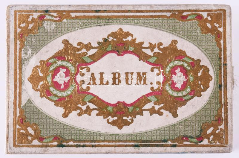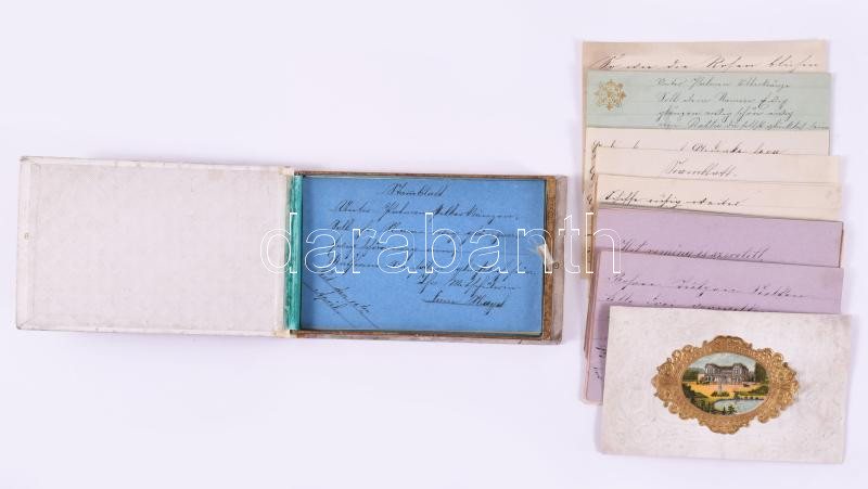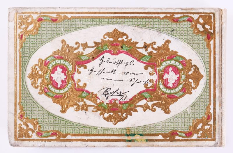 1873-1875 Pest, emlékkönyv (doboz) 25 különálló lapon magyar és német nyelvű bejegyzésekkel (leányiskolai iskolatársaktól), dekoratív, könyvszerű kartondobozban, 9x14x1,5 cm