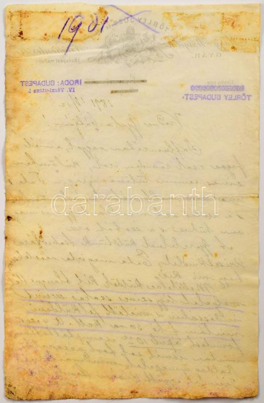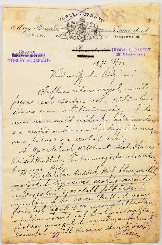 1891 Törley József (1858-1907) pezsgőgyáros autográf levele, "Kedves Gyula bátyám!" megszólítással. Feltehetőleg testvére, Törley Gyula (1855-1934) nagybirtokos, lótenyésztő részére, Törley József és Társa Magyar Pezsgőbor Gyűr Promontor fejléces papíron, átbélyegzett címmel. "Influenzában vagyok, ennél fogva csak röviden irok. Különben sincs semmi különös újság. ... Irénnel együtt kiván szerető öcséd Józsi.", foltos, 1 sztl. lev., 23x15 cm.