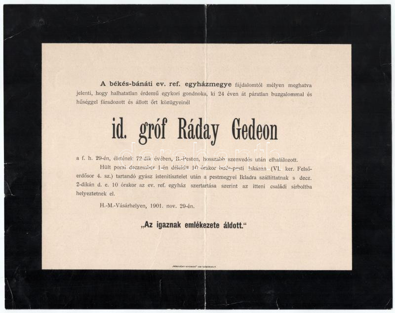 1901 id. gróf [Rádai] Ráday Gedeon (1829-1901) katona, főrendiház tagja, a délvidék királyi biztosának halálozási értesítője, hajtott, kissé szakadásokkal, hajtott, 23x29 cm