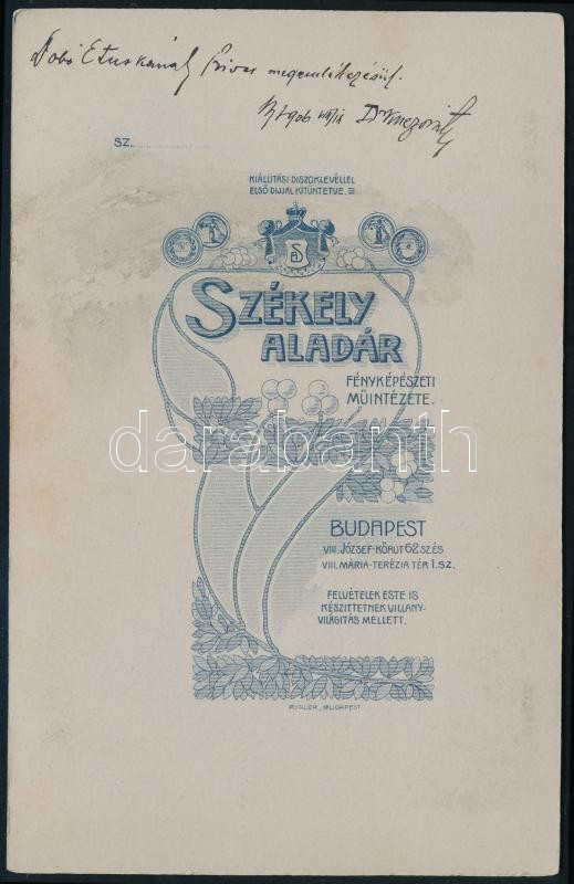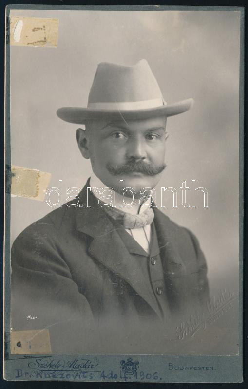 1906 Dr. Knezovits Adolf (1870-1922) ügyvéd portréja, a hátoldalon saját kezű dedikációjával (,,Dobó Etuskának szives megemlékezésül. Bp 1906 VIII/11 Dr. Knezovits"). Kabinetfotó Székely Aladár budapesti műterméből, bal szélén ragasztás nyomaival, 16,5x10,5 cm