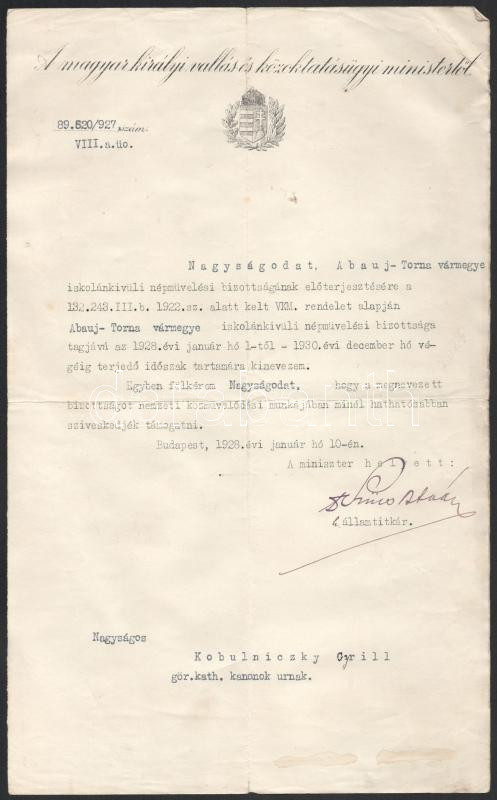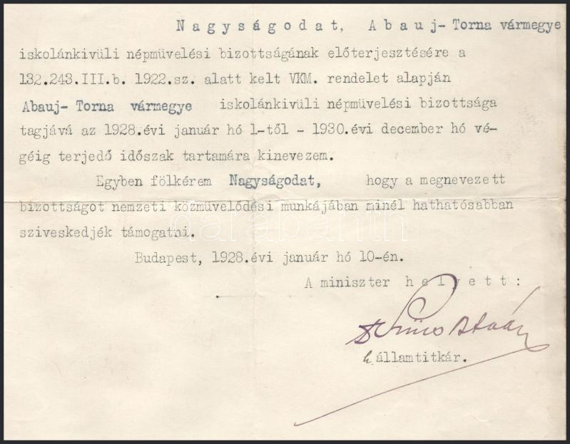 1928 Bp., Szücs István, szül. Frankl Mózes (1867-1953) politikus, helyettes államtitkár, Antall József miniszterelnök anyai nagyapjának autográf aláírása kinevező okiraton, Kobulniczky (Cirill) Cyrill (1882-1949) görögkatolikus kanonok Abaúj-Torna vármegye iskolánkívüli népművelési bizottságának tagjává való kinevezésről, a lap egyik sarka kissé gyűrött, alján kis foltokkal, 34,5x21 cm