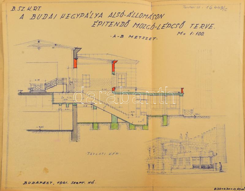 1931 Bp., a Budai Várban építendő személyszállító lift és páternoszter tervrajzai, a Ganz és Társa cég által készített 3 db hivatalos tervrajz, lapszéli sérülésekkel, 35x38 cm és 61x42 cm között + 1941-1942 A BSZKRT Budai Hegypálya (Budavári sikló) alsó-állomáson építendő mozgólépcső 2 db tervrajza (30x34 cm és 42,5x80 cm), valamint a Wertheim F. és Társa Utóda Magyar Felvonó- és Gépgyár R.T. tájékoztató ajánlata a mozgólépcső kiépítésére, 6 p.