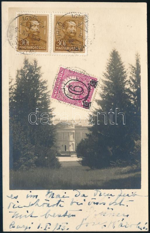 Károlyi József gróf (1884?1934): jogász, földbirtokos, országgyűlési képviselő, IV. Károly halála (1922) után a magyar legitimisták politikai vezére, a Magyar Férfiak Szentkorona Szövetségének alapítója (1926) és egyik vezetője, Károlyi Mihály féltestvére. Az utolsó Wekerle-kormány Fejér vármegye főispánjává nevezte ki 1917 júliusától, miután azonban kitört az őszirózsás forradalom, 1918 novemberében lemondott tisztségéről, és az ő indítványának köszönhetően Fejér vármegye törvényhatósági közgyűlése 1919 februárjában bizalmatlanságot szavazott féltestvére, Károlyi Mihály kormányának. Ez volt tulajdonképpen az első ellenforradalmi megmozdulás. A Tanácsköztársaság bukása után ismét Fejér vármegye főispánja lett, de miután második visszatérési kísérlete után őrizetbe vették IV. Károlyt, tiltakozásul 1921. október 23-án lemondott tisztségéről. 1922 februárjában követte a száműzött királyi családot Madeirára, ott volt az 1922. április 1-jén elhunyt uralkodó halálos ágyánál is. 1934. szeptember 10-én bekövetkezett halála előtt Károlyi József már évek óta betegeskedett, a képeslapot 1933. január 1-jén írta (a szöveg végén olvasható: Jozef Karolyi), és 3-án adták fel Fehérvárcsurgón. A képeslapon (részben) látható fehérvárcsurgói kastély 1844?1851-ben épült Károlyi György megbízásából, 1888-ban Károlyi Gyula, majd fia, József lett a tulajdonosa. ?Nevéhez fűződik az épület díszudvar felőli homlokzatának 1910 körüli eklektikus, barokk átalakítása.?