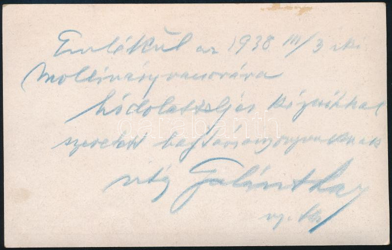 1938 Vitéz Galánthay Glock Tivadar (1872-1956) vezérőrnagy, országgyűlési képviselő, festőművész, történész autográf sorai egy őt ábrázoló nyomtatványon, 14x9 cm