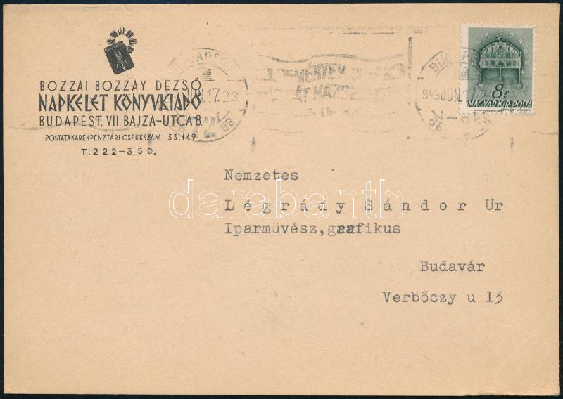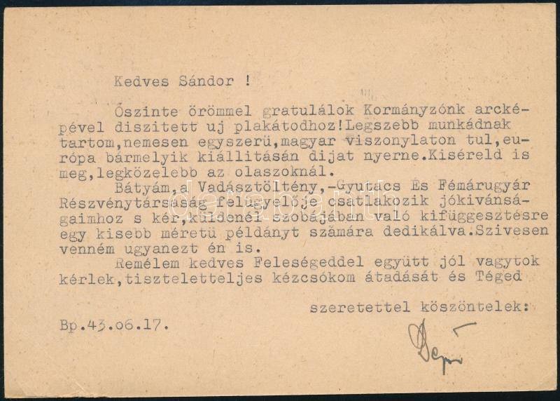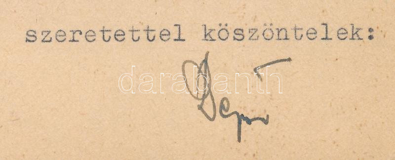 1943 Bozzai Bozzay Dezső, a Napkelet Könyvkiadó vezetőjének gépelt levelezőlapja, autográf aláírásával Légrády Sándor (1906-1987) festőművész, grafikus részére.
