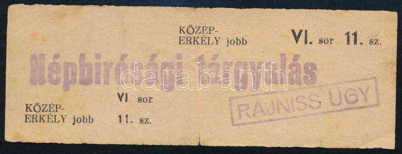 Beschreibung: 1946 Bp., Rajniss Ferenc (1893-1946) a Zeneakadémia nagytermében tartott népbírósági tárgyalásának belépőjegye