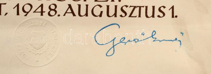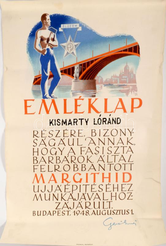 1948 Emléklap a Margit híd újjáépítésében való részvételért, Kismarty-Lechner Loránd (1883-1963) építész, Kismarty-Lechner Jenő fivére, Lechner Ödön unokaöccse részére Gerő Ernő közlekedési miniszter nyomtatott aláírásával. Hajtva 29x43 cm