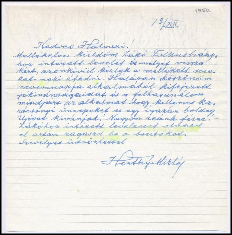 1950 [Estoril, 1950.] XII. 13., vitéz nagybányai Horthy Miklós (1868-1... https://www.darabanth.com/de/45-Gross-Auktion/45.1/Kunst-Dokumente-andere-Sammelgebiete/Historische-Dokumenten-Handschriften~18992/1950-Estoril-1950-XII-13-vitez-nagybanyai-Horthy-Miklos-1868-1957-sajat-kezzel-irt-le~II3403085