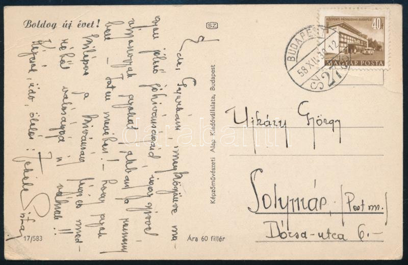 Beschreibung: 1958 Fekete István (1900-1970) író autográf képeslapja Ujházy György (1895-1971) forgatókönyvírónak költői képpel megírt jókívánsággal
