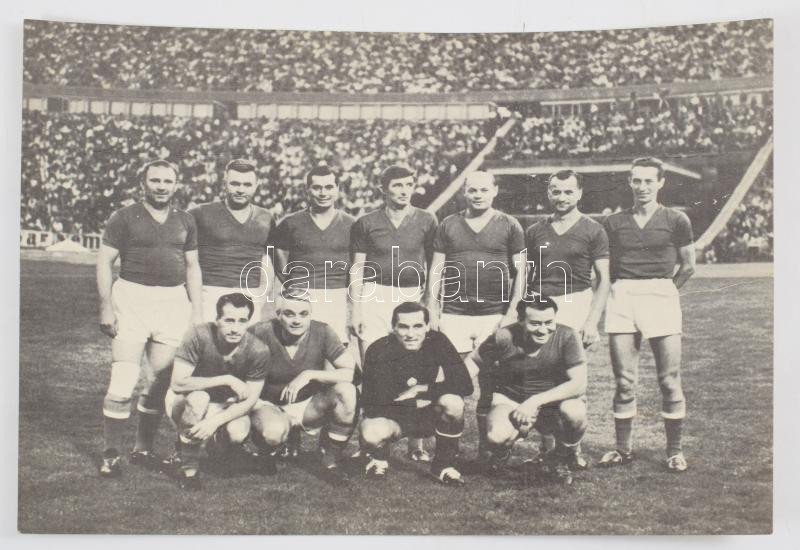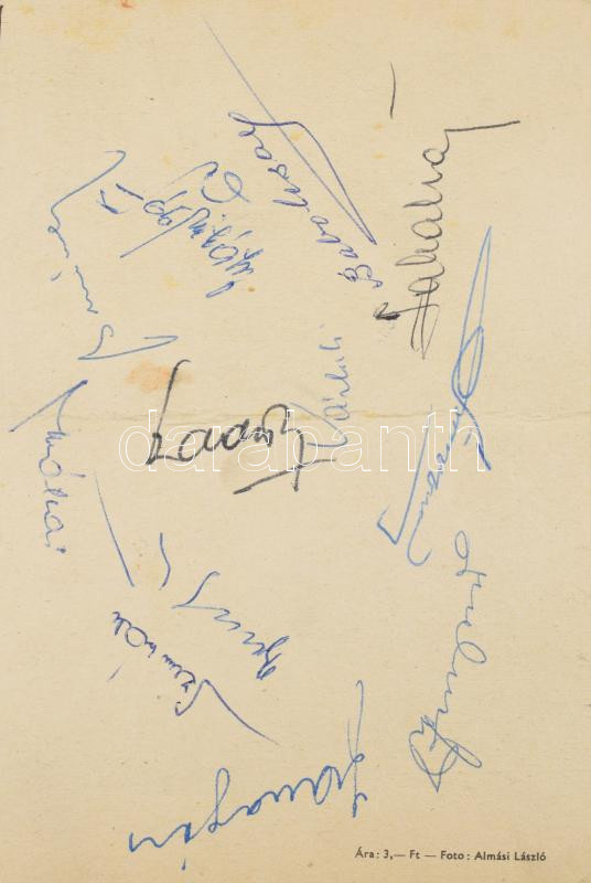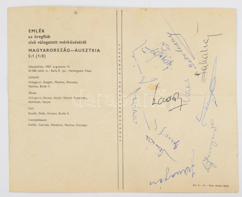 1967 Magyarország-Ausztria (5:1) öregfiúk labdarúgó mérkőzés játékosok által aláírt lap, közötte Aranycsapat játékosokkal is: Zakariás, Babolcsai, Mátrai, Faragó, stb. Beszakadással. 23x18 cm 1967 Hungary-Austria (5:1) old boys football match sheet signed by players: Zakariás, Babolcsai, Mátrai, Faragó, etc.