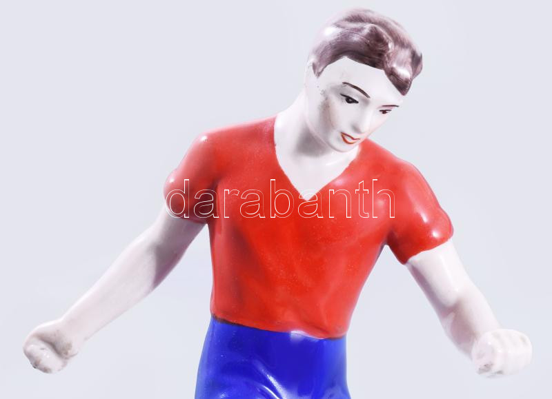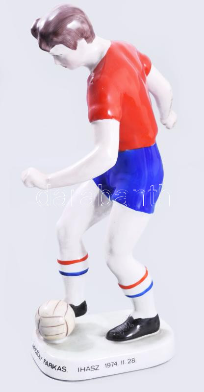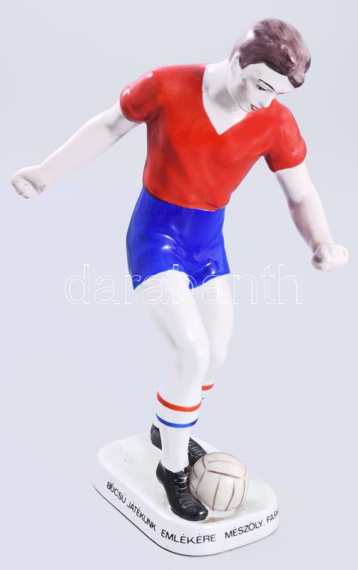 Porcelain football player figure in Vasas jersey, made on the occasion of the farewell match of footballers Kálmán Mészöly (1941?2022), Kálmán Ihász (1941?2019), and János Farkas (1942?1989), held on February 28, 1974. Signed on the base by Kálmán Mészöly. Unmarked, hand-painted, flawless condition, height: 26.5 cm. It is noteworthy that the three players were forced to retire prematurely at the age of 30?32 due to behavioral issues, and this farewell match therefore became an iconic event in the history of Hungarian football.