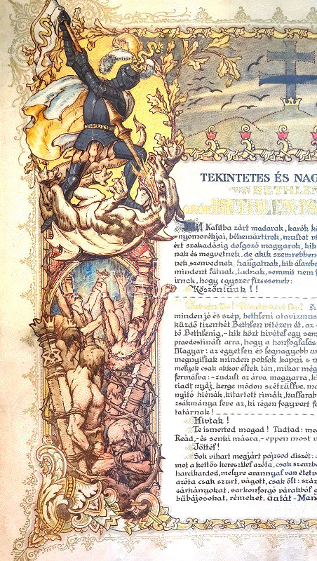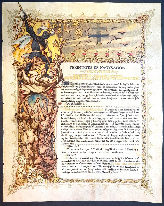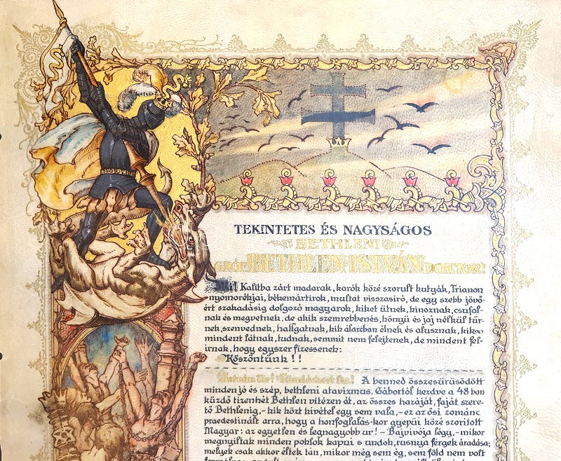 [Díszoklevél] Gróf Bethlen István országgyűlési képviselő Trianon utáni politikai szerepvállalását magasztaló, köszöntésére készült, pergamenre kézzel festett, illusztrált aranyozott díszoklevél, tekintetes és nagyságos megszólítással. Ismeretlen grafikus műve. (1921 tavasza).