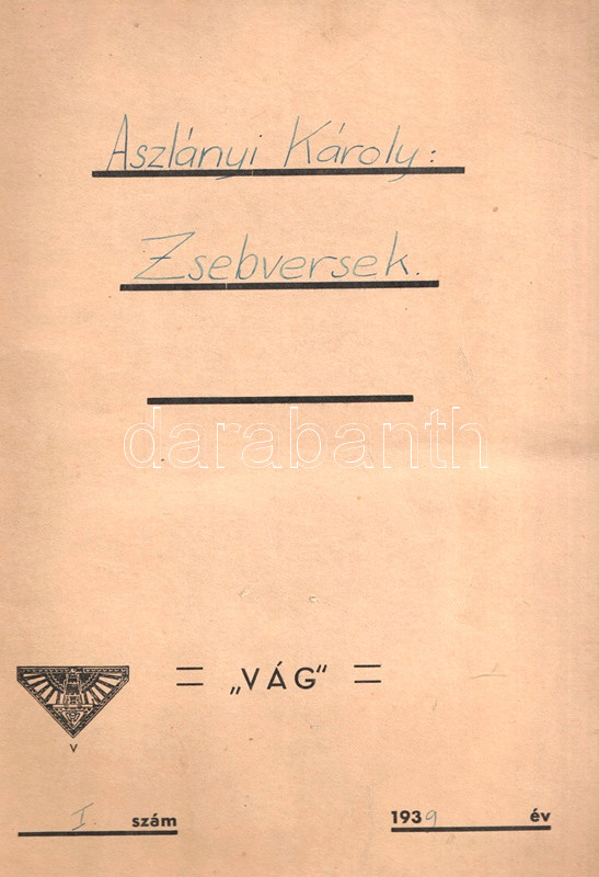 Jó állapotú lapok, szerkesztői feliratozással ellátott korabeli mappában, "Aszlányi Károly: Zsebversek, 1939. év I. szám" felirattal.