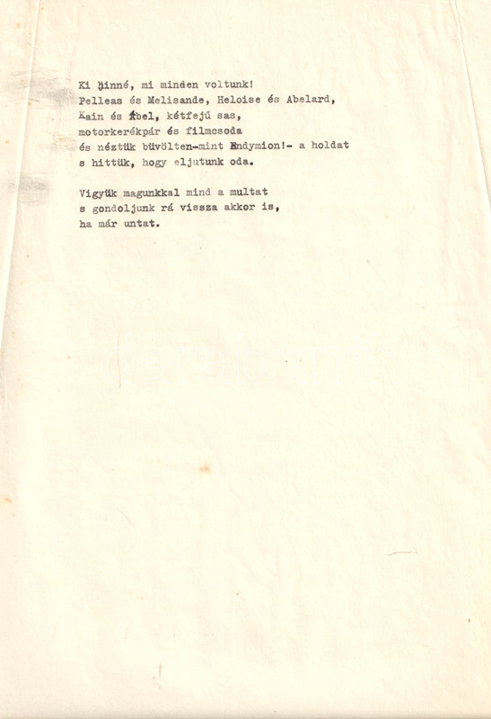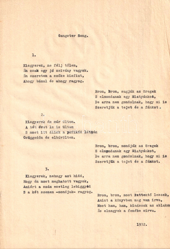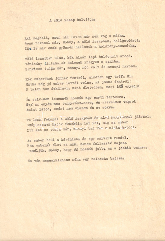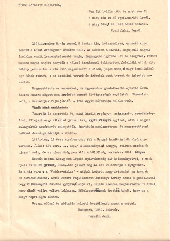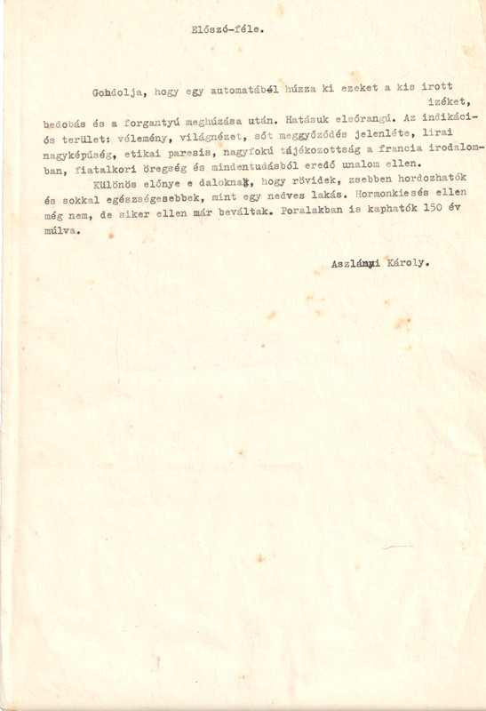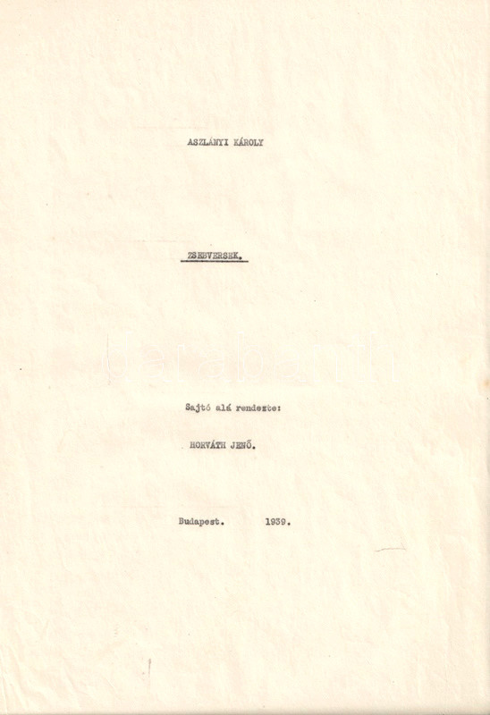 A tragikusan fiatalon, autóbalesetben meghalt Aszlányi Károly (1908-1938) újságíró, színpadi szerző, forgatókönyvíró, a két világháború közti kalandregényírás egyik mestere 1927-től novellákkal, kritikákkal és versekkel jelentkezett a Nyugat hasábjain. A verseiben számos szerepet felvevő urbánus költő a Heltai Jenő-i félig komoly, félig tréfás, szerepjátszó modort vitte tovább szövegeiben. Szerkesztőhöz eljuttatott, gépelt kéziratlapjaiból Horváth Jenő készített kötettervet, nekrológként is funkcionáló előszavát is ő írta. Publikálatlan kézirat-gyűjteményünk a tartalomjegyzék tanúsága szerint a 43 versből álló verseskötet 30 versét tartalmazza hiánytalanul, néhány kéziratoldalon ismeretlen kéz által írt korrektúra-jelekkel. Számos levélen kisebb lapszéli gyűrődések.